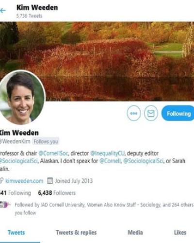 In "Twitter's Gender Imbalance," CSI's Director and Jan Rock Zubrow Professor of the Social Sciences, Kim Weeden, discussed new research that suggests that female academics get disproportionately less engagement on Twitter than their male counterpart. Prof. Weeden said the study "seems consistent with other, experimental research on how both men and women assess other men and women in terms of competence. That is, when evaluators lack background information to evaluate a person's competence or expertise, as is often the case on Twitter, they rate men as being more competent than women.” The study authors are Jane M. Zhu, Artur P. Pellullo and Sayed Hassan, "Gender Differences in Twitter Use and Influence Among Health Policy and Health Service," published by JAMA Internal Medicine.